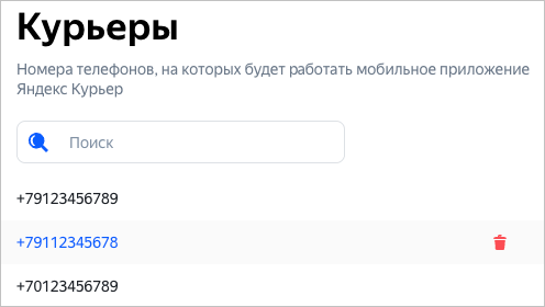 В этом разделе вы можете добавить номера телефонов курьеров, которым нужно работать с приложением Яндекс Курьер.