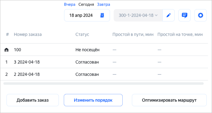 По умолчанию отображается информация за сегодняшний день. Чтобы посмотреть работу курьера за другую дату, используйте ссылки Вчера, Завтра или введите произвольную дату.