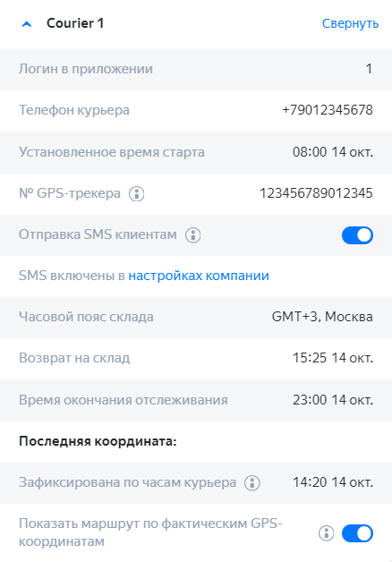 Опция включает отображение маршрута курьера по его фактическим координатам, которые поступают c мобильного приложения Яндекс Курьер или через GPS-трекер. Подробнее см. в разделе Настройка передачи данных c устройств.