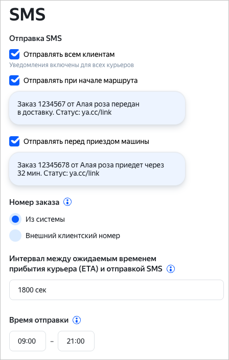 - Время отправки — интервал, когда можно присылать сообщения. SMS не отправится, если маршрут курьера начнется раньше или позже этого интервала.