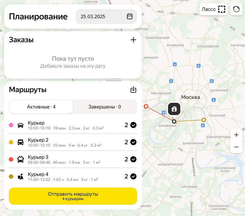 Чтобы распределить заказы между курьерами и запланировать маршруты вручную: