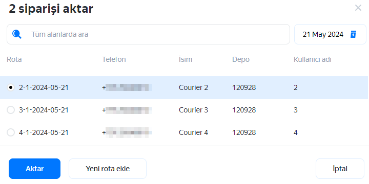 Rotayı bir bütün olarak başka bir kuryeye aktarabilirsiniz. Bunu yapmak için → Rotayı kuryeye aktar. Aradığınız kurye listede yoksa onu listeye ekleyebilirsiniz.