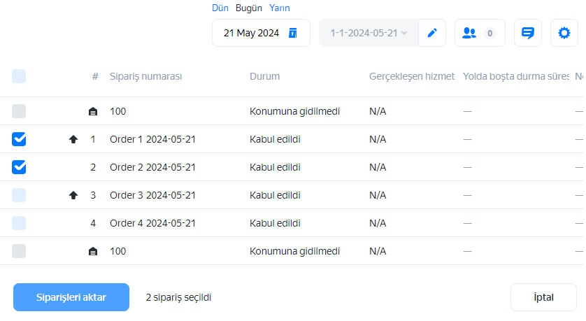 Siparişin teslimat gününde çalışmayan kuryelerin rotalarına sipariş aktaramazsınız. Ara depoya uğramayı başka bir rotaya aktaramaz fakat ara depoya bağlı olan siparişi başka bir rotaya aktarabilirsiniz.