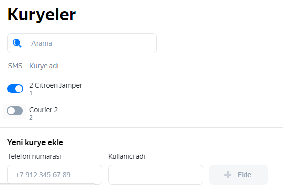 Telefon numarasını +90xxxxxxxxxxxx formatında ve yeni kuryenin kullanıcı adını belirtip Ekle'ye tıklayın.