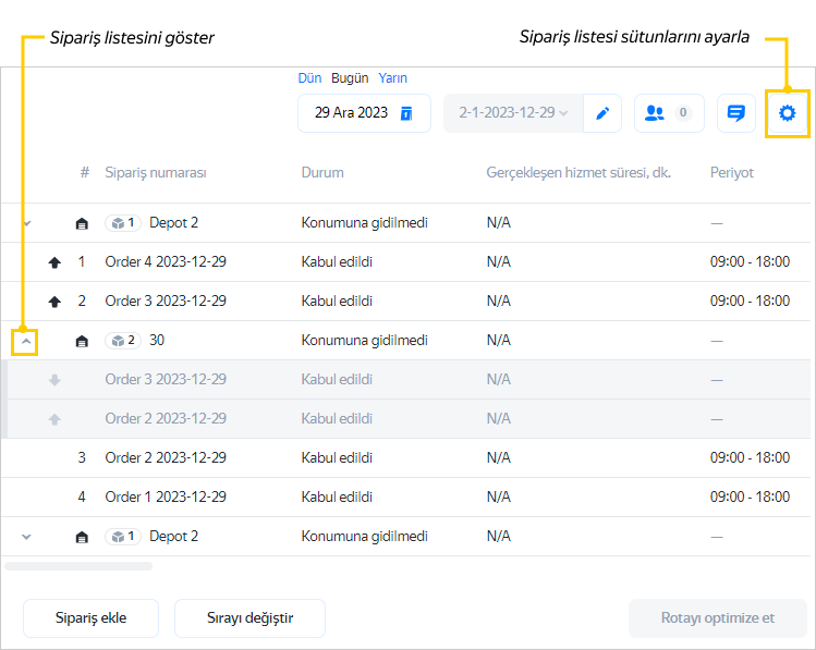 Rotaya ek siparişler ekleyebilir ve rotadaki durakların (sipariş teslim noktalarının ve depoya uğrama noktalarının) sırasını istediğiniz gibi ayarlayabilirsiniz. Depoya uğramaların listede gösterilmesi için Depoları İzleme Sistemi'nde göster seçeneğini etkinleştirin.