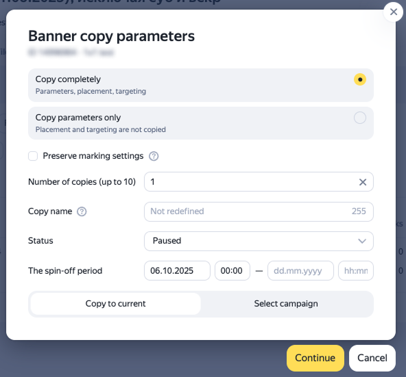 Copy completely / Copy parameters only: Select the Copy completely option to copy the parameters, placement, and targeting. Copy parameters only means that the copy will be created without placement and targeting — they will be inherited from the campaign.