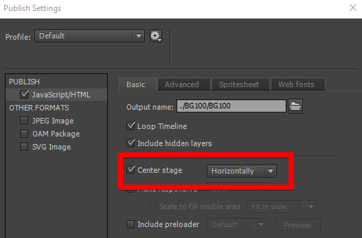 To place the creative in the center, you need to set the central location in the editor settings. For example, in Adobe Animate CC, go to Publish Settings → Center Stage:
