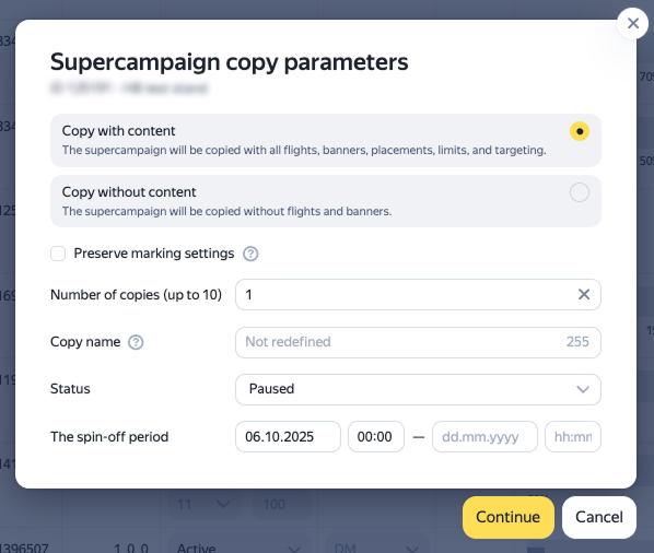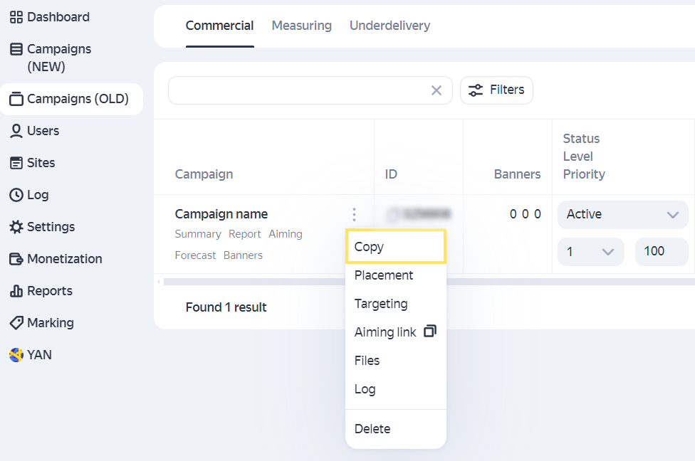 A new campaign will be created based on the selected one with the same general settings, placements, restrictions, and targeting settings. The start date for the newly created item matches the copying date. Statistics aren't copied.