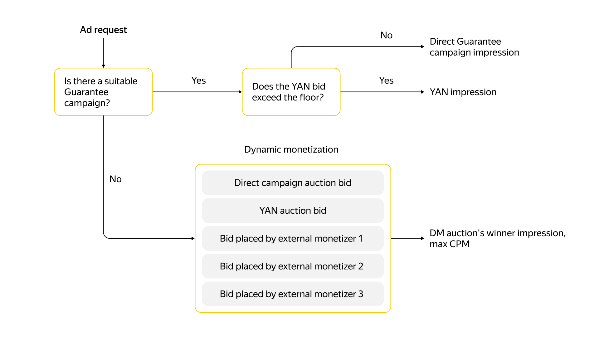 If the Yandex Advertising Network's bid loses, a Guarantee campaign selected at Step 2 is served.
