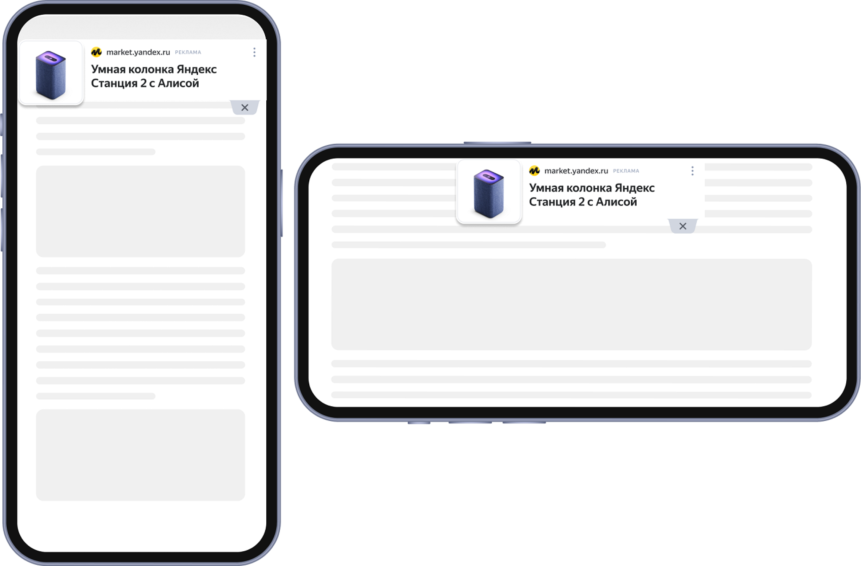 Adfox позволяет отрисовать баннеры в блоке Floor Ad как в мобильной, так и в десктопной версии сайта. В блоке можно показывать рекламу из Рекламной сети Яндекса и внешних монетизаторов, а также прямые продажи или собственное промо. При этом дополнительные обертки не нужны: все необходимые элементы рекламы Floor Ad (кнопка Закрыть, подложка) будут добавлены автоматически.