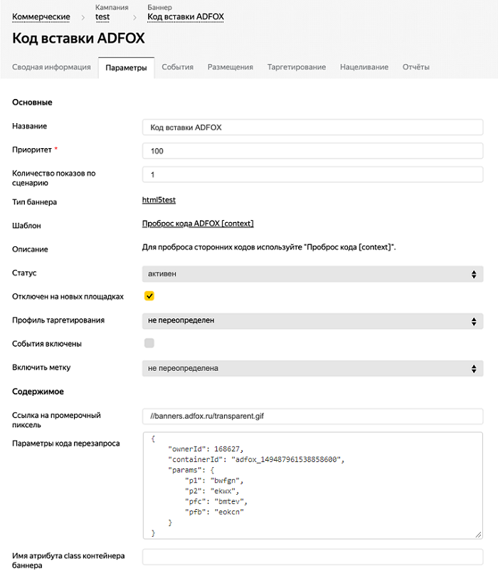 Обращаем внимание, что в момент сохранения баннера, параметры кода перезапроса будут специальным образом обернуты в кавычки. Это нужно для работоспособности кода, не изменяйте получившийся после сохранения баннера код.
