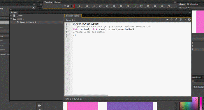 Пример готового проекта с несколькими кнопками в Adobe Animate CC, исходный файл.
