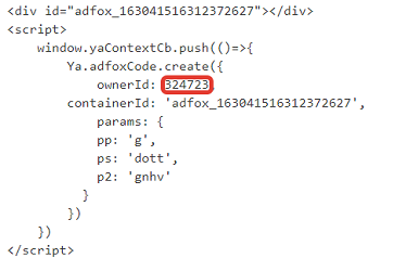 Для монетизаторов, которые работают через Adfox HB, укажите идентификатор аккаунта монетизатора в Adfox (ownerId). Узнать его можно от монетизатора или из кода вставки монетизатора.