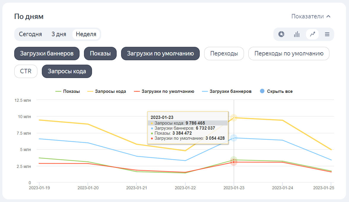 В отличие от отчета виджет содержит данные за небольшой период времени: день, последние три дня или неделю. Данными можно гибко управлять: менять их представление и редактировать набор показателей на диаграмме — без обновления страницы.
