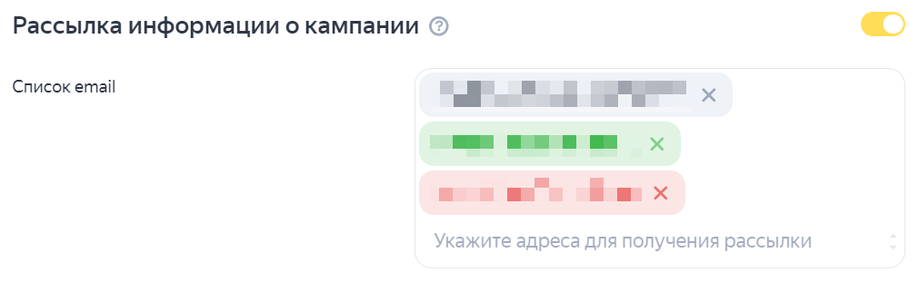 В параметрах кампании адреса получателей будут отмечены цветом: