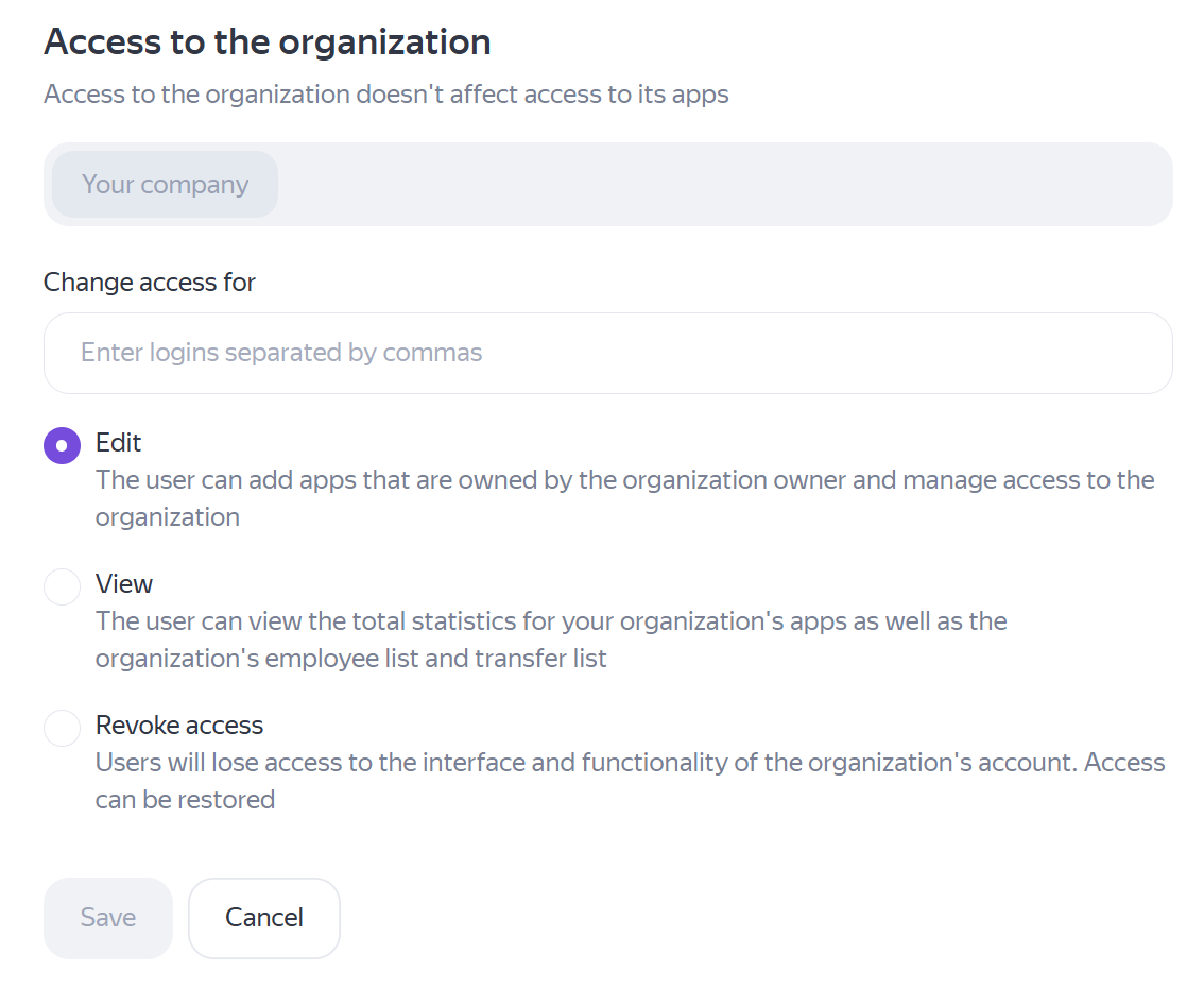 - Edit: The user will get full rights, same as the organization owner.