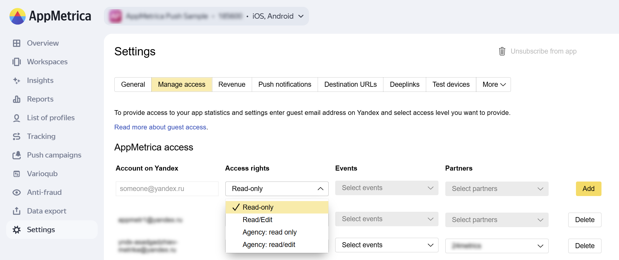 Agency: read/edit — The user can change app settings, configure and create trackers, and view statistics for selected traffic sources and target events.