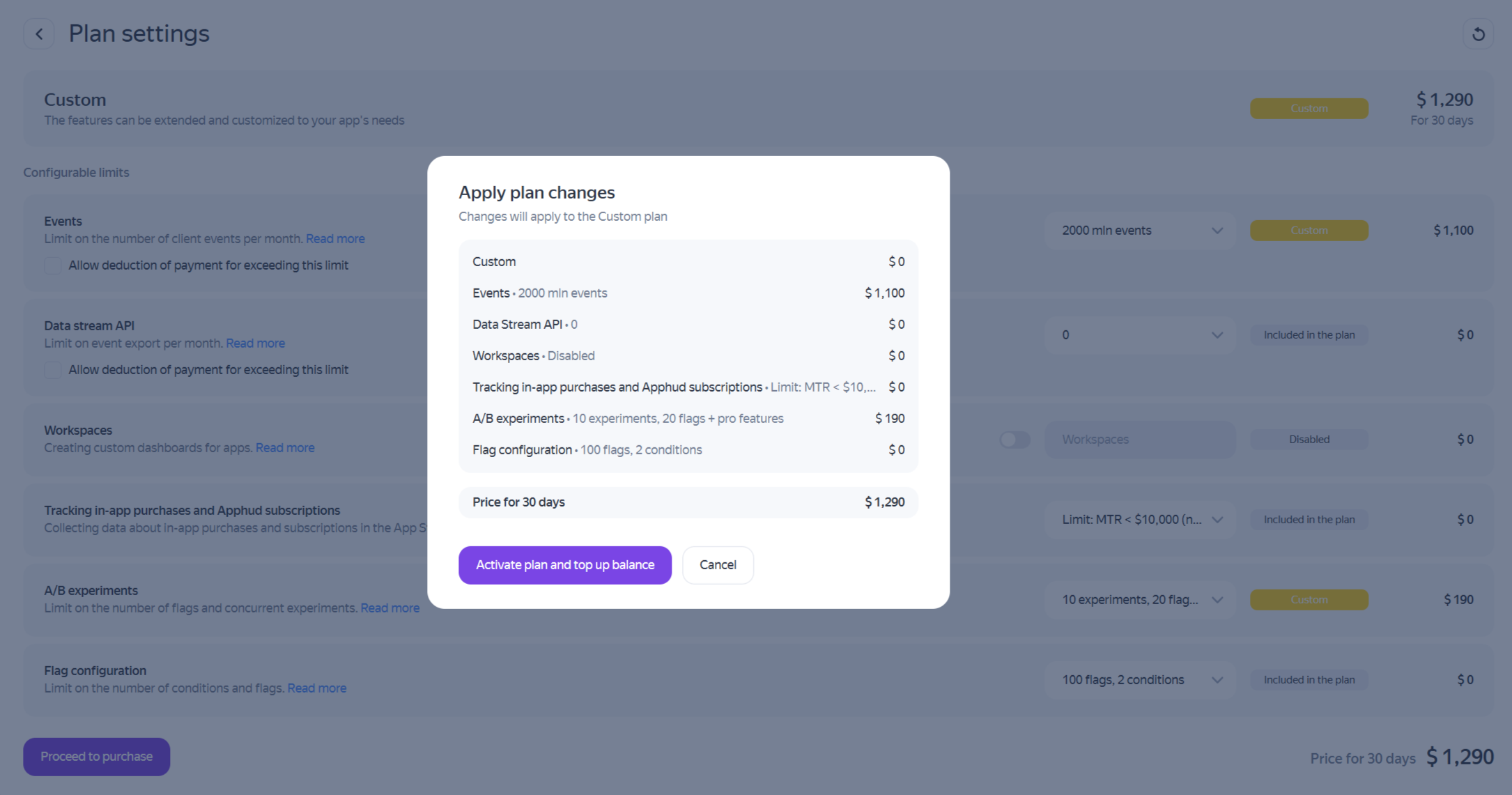 Double-check your settings. If everything is correct, click Activate plan and top up balance.