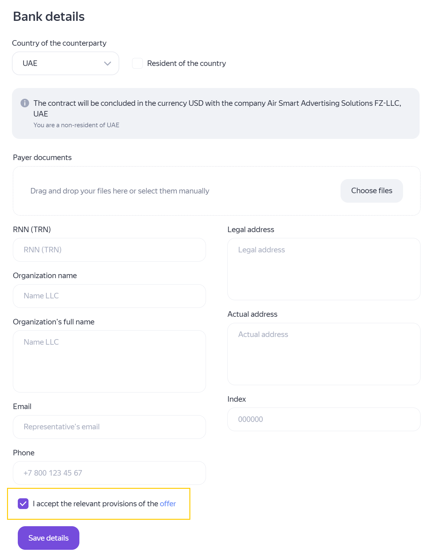 Fill in your bank details at the bottom of the page. These details will be used for invoicing, and the payer you entered will be specified in our records when we receive payments from you.