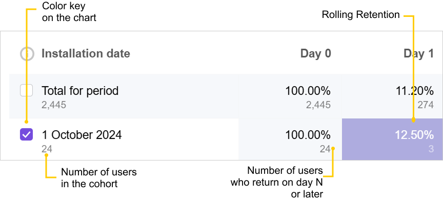 - On the fourth day after the installation (Day 4), none of the 4 users returned to the app, but 2 users will return during the selected period. The rolling retention metric is 50%.