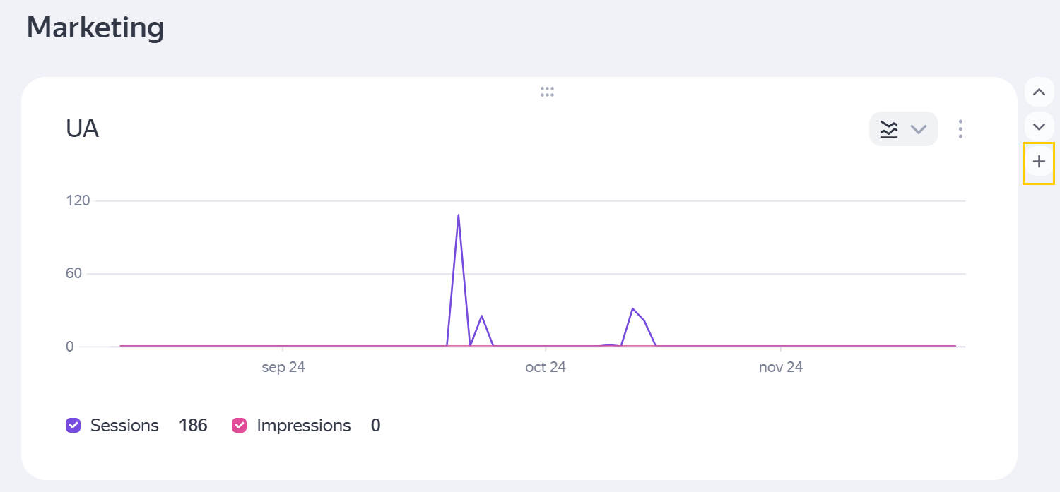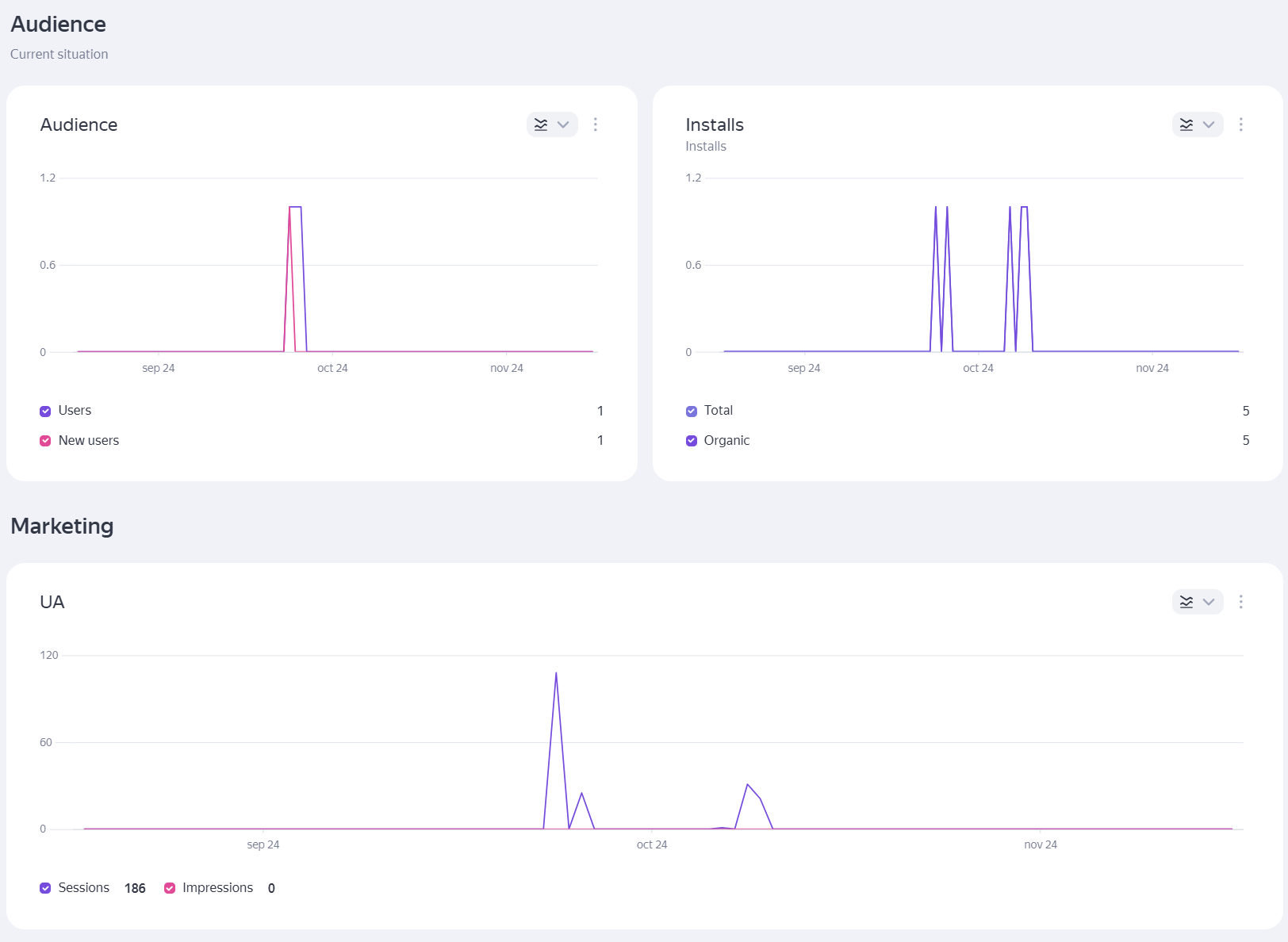 A workspace is a set of widgets with AppMetrica data. By default, AppMetrica provides access to the main Overview workspace. In the Workspaces section, you can create custom workspaces tailored to your app and each team's needs. You can add a variety of widgets to your workspace, reordering them once they're there. Each widget leads to the corresponding report.