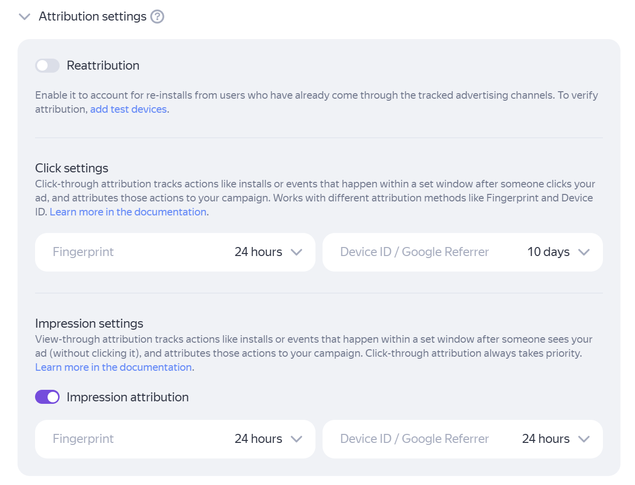 For test devices, reattribution is always enabled (regardless of the option status). For more information about adding test devices, see Testing attribution.