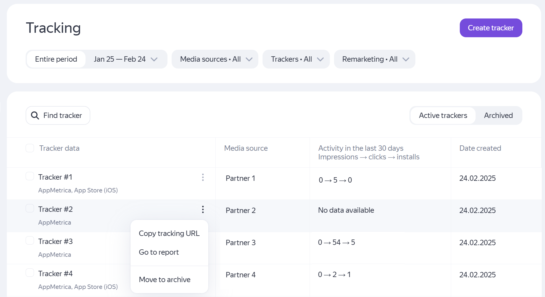 A tracker is automatically archived if it hasn't recorded any app installs or deeplink events within 365 days. Once archived, the tracker's statistics remain available in reports, but new data is no longer attributed, even if the campaign is still active in the ad network.