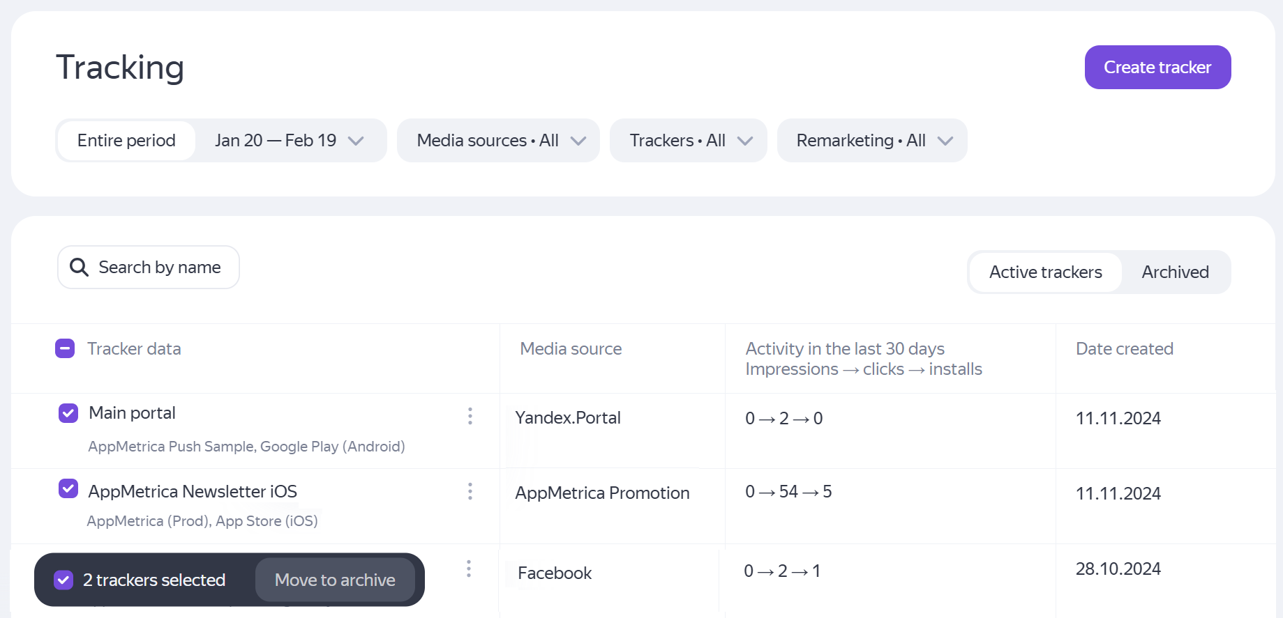 You can view the trackers configured in AppMetrica under Tracking → Tracker list.