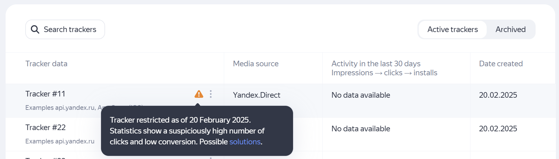 If your tracker data shows a high volume of clicks or impressions but unusually low conversion rates, especially in terms of app installs, this could be a sign of click flooding. Clicks and impressions for such trackers may not be processed. In the list, the tracker is marked with the