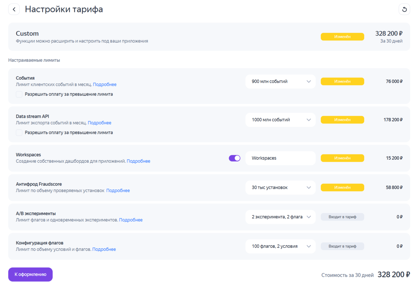 Откроется страница с настройкой тарифа в виде калькулятора. Выберите нужные инструменты, если нужно — увеличьте лимиты. При каждом изменении будет меняться статус строки, а внизу будет отображаться общая стоимость подключаемых услуг.