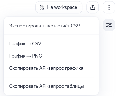 Для получения текста запроса к API отчетов вы можете воспользоваться меню Экспорт в интерфейсе AppMetrica. Для этого откройте отчет, сформируйте сегмент, временной интервал, группировку и нажмите кнопку Экспорт над графиком. В меню выберите Скопировать API-запрос таблицы или Скопировать API-запрос графика. Подробнее об экспорте данных в разделе Работа с отчетами.