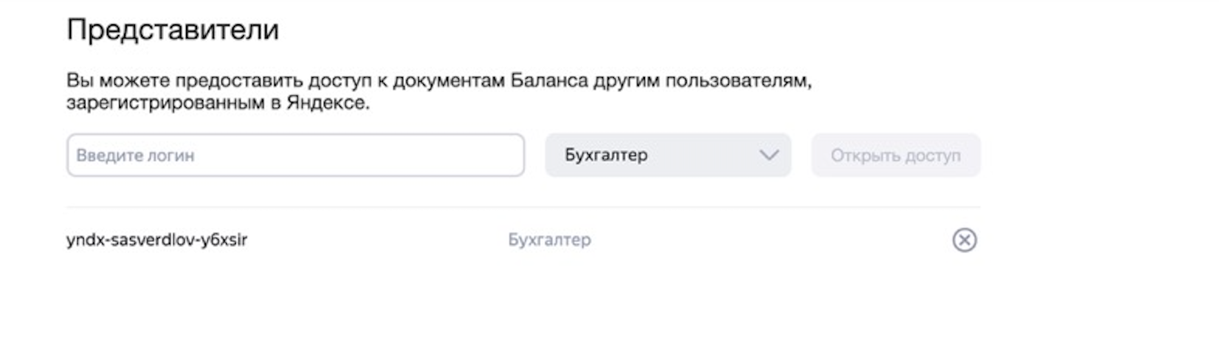 Доступ вы можете предоставить, только если у бухгалтера существует отдельный новый логин на Яндексе, для которого не было зарегистрировано рекламных кампаний и он не использовался никогда ранее. Чтобы предоставить доступ: