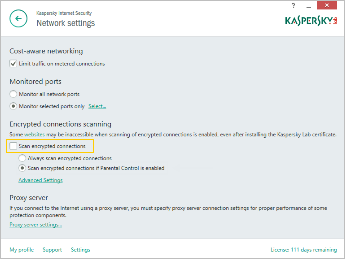 In the Encrypted connections scan section, enable the Do not scan encrypted connections option.