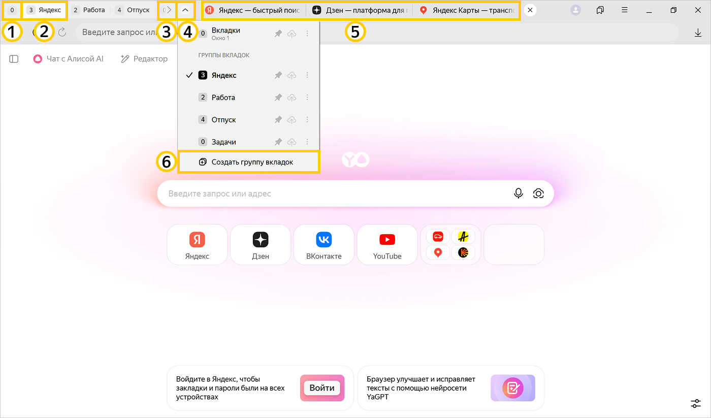 В Яндекс Браузере группы вкладок можно открывать в любом окне. Для этого нажмите значок и выберите нужную группу.