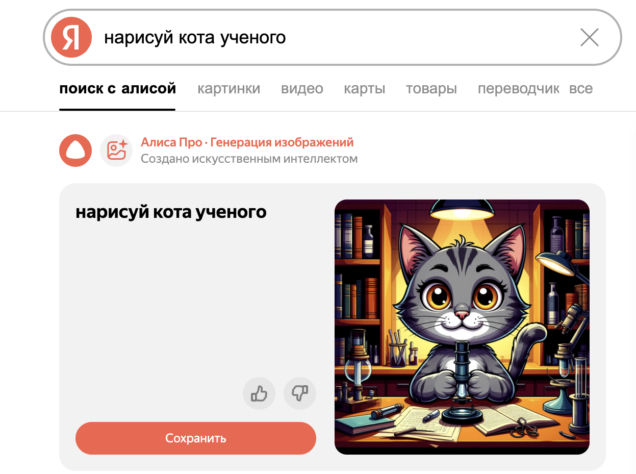 В Умной строке опишите, что хотите увидеть на изображении, например «нарисуй кота ученого».