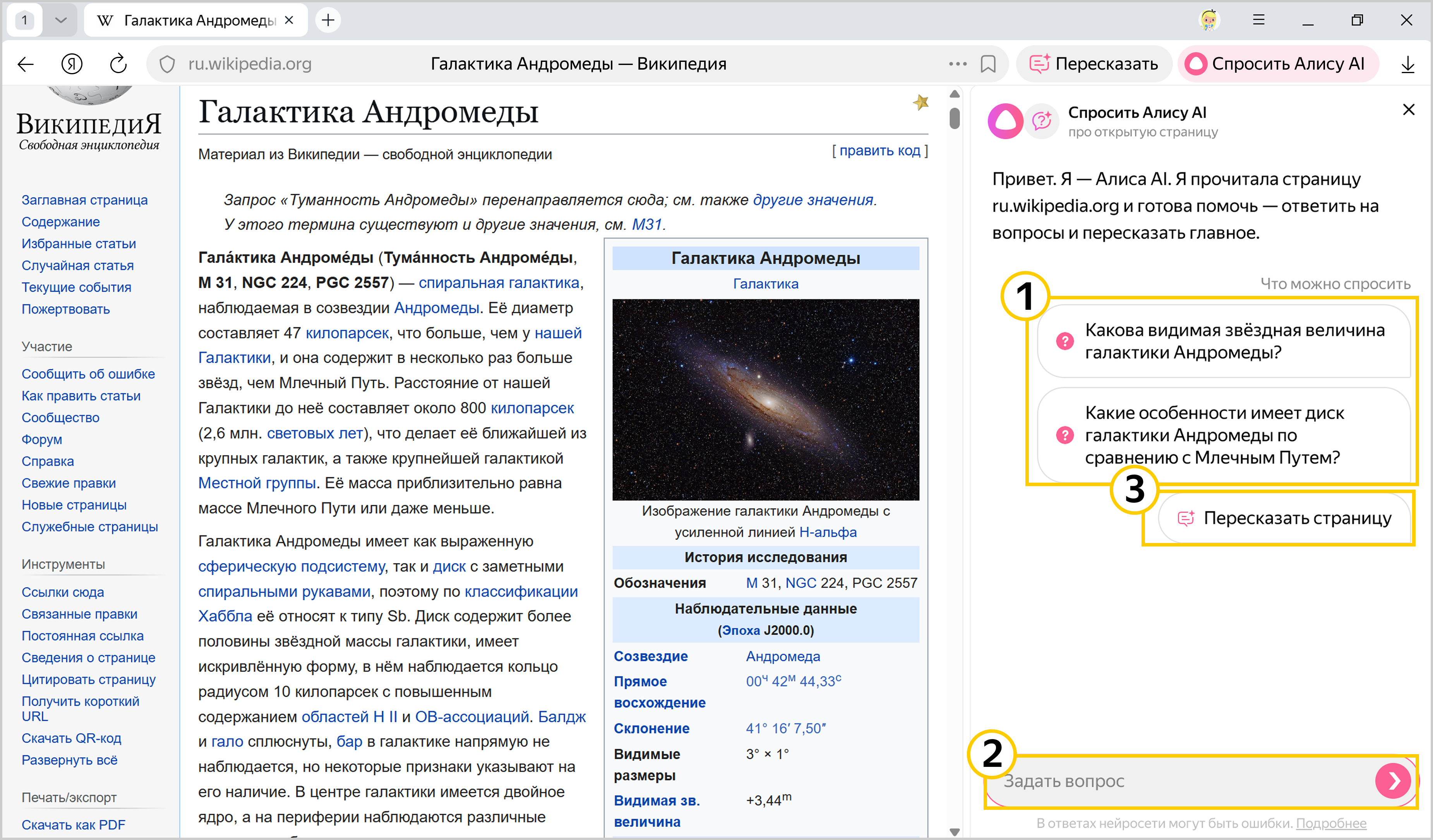 Нажмите на один из предложенных Алисой вопросов — они подготовлены с учетом контекста страницы.