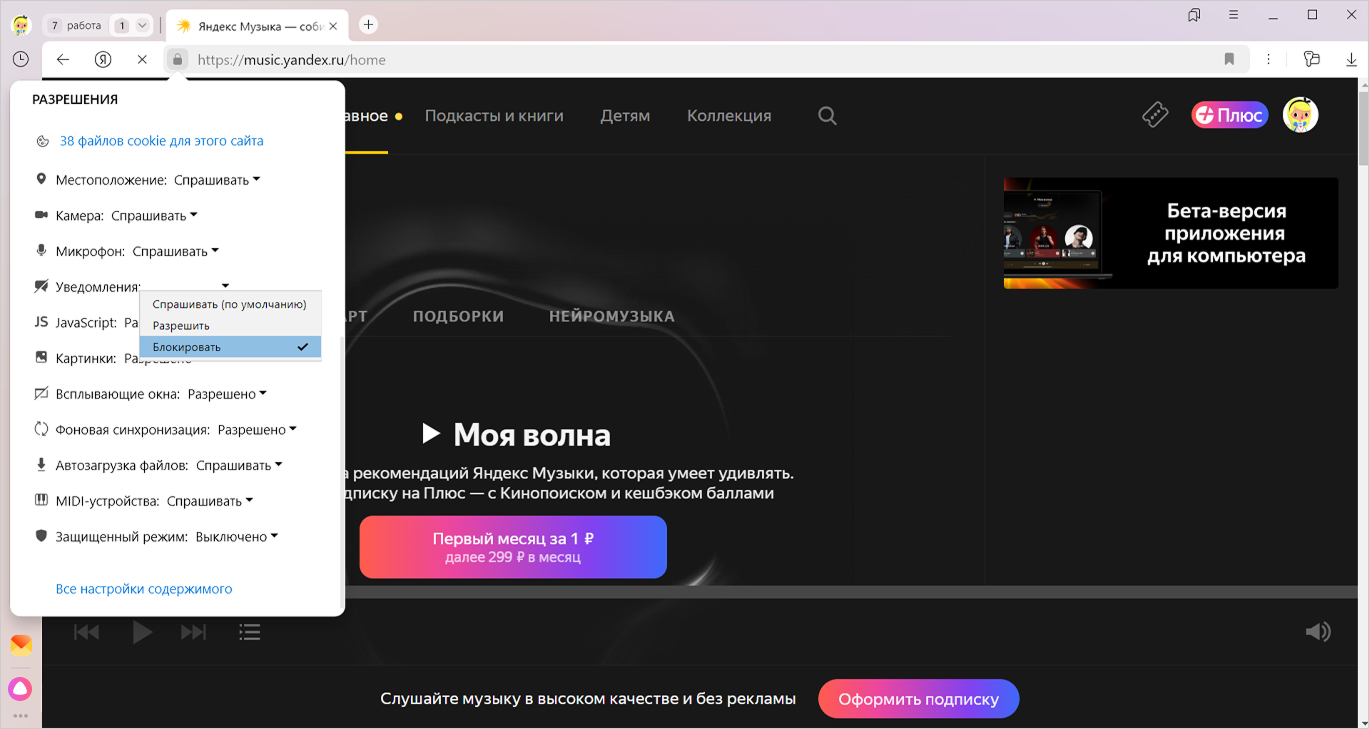• Спрашивать — если сайт запросит доступ к электронным музыкальным инструментам, использующим интерфейс MIDI, Браузер предупредит вас об этом.