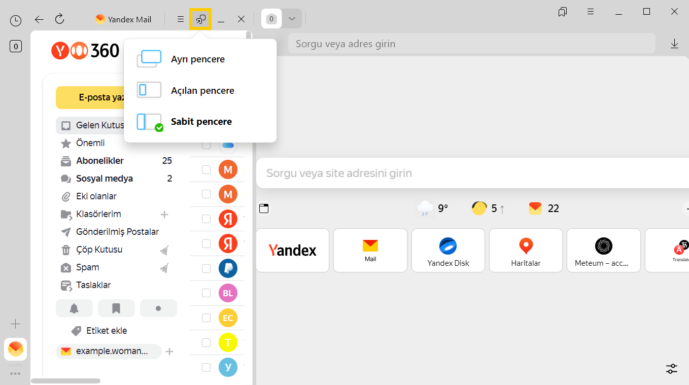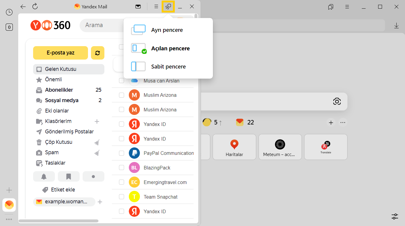 Favori servislerinizi web uygulamaları gibi kullanabilmek için onları yan panele ekleyin; böylece bunları tek tıkla açabilir ve sürekli istenilen sekmeyi aramaktansa ayrı bir pencerede bu servislere kolayca erişirsiniz. Örneğin, Yandex Browser beta sürümünün birçok sekme içeren ana penceresini açmadan Yandex Mail’deki e-postaları kontrol edebilir.