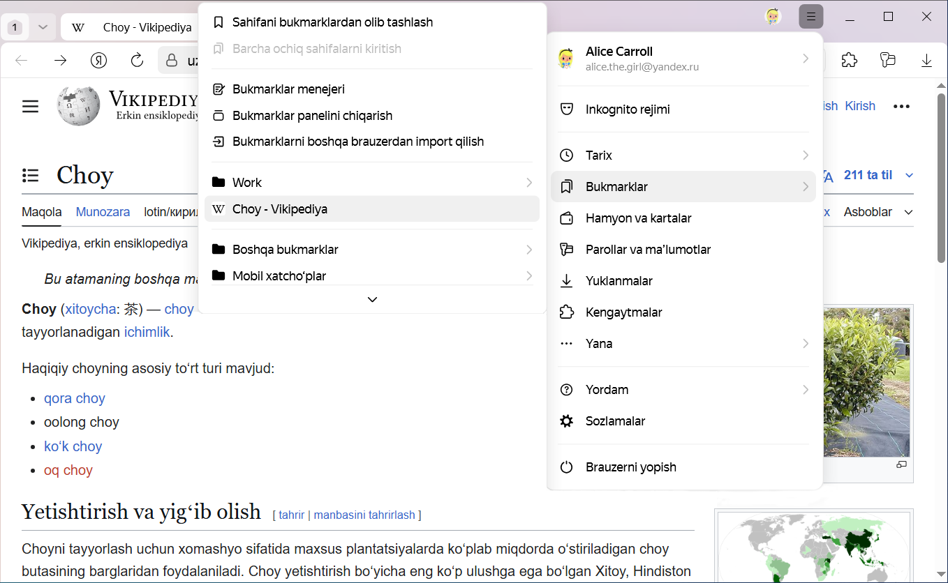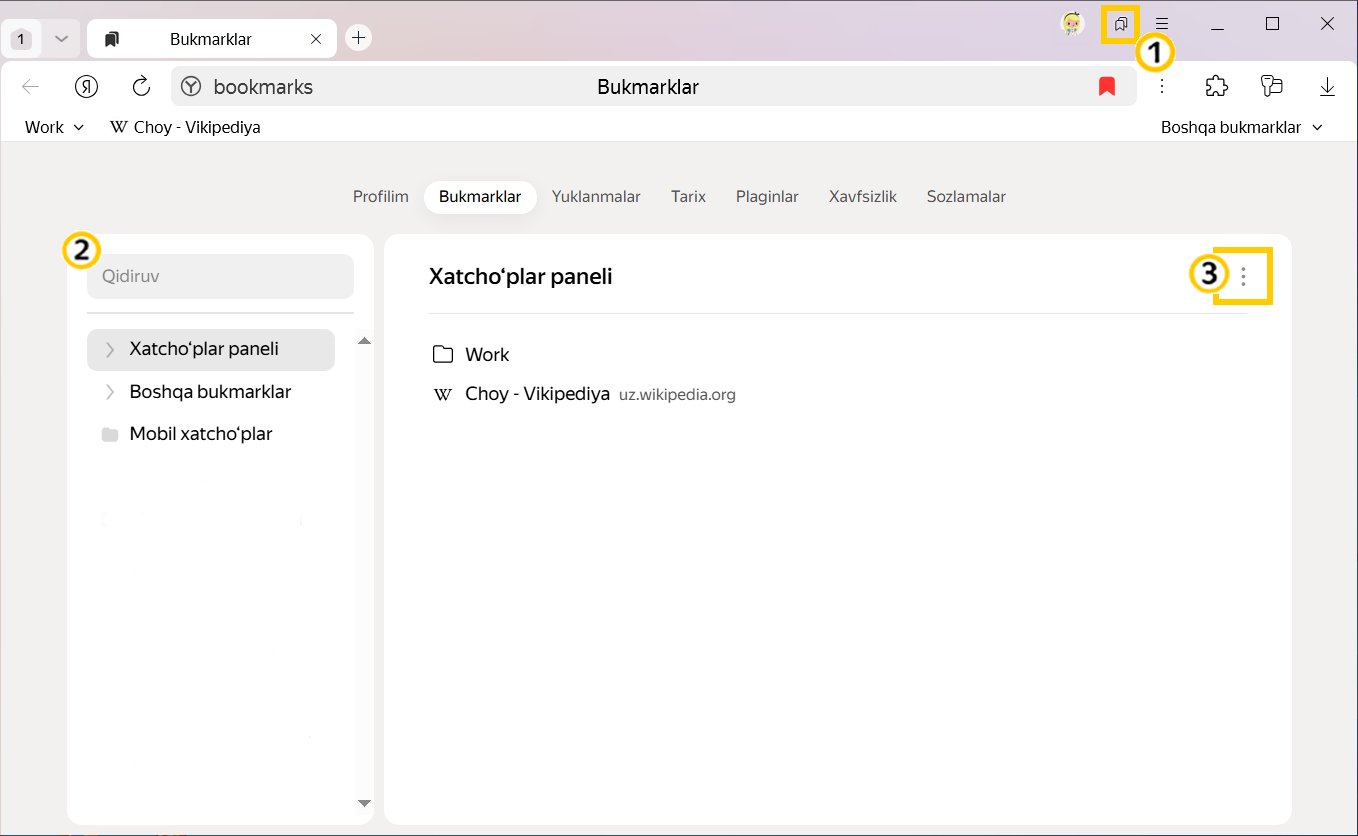 Agar bukmarklaringiz va bukmarklar joylashgan jildlaringiz doimo koʻz ostingizda boʻlishini istasangiz, Aqlli satr ostida bukmarklar panelini yoqing.