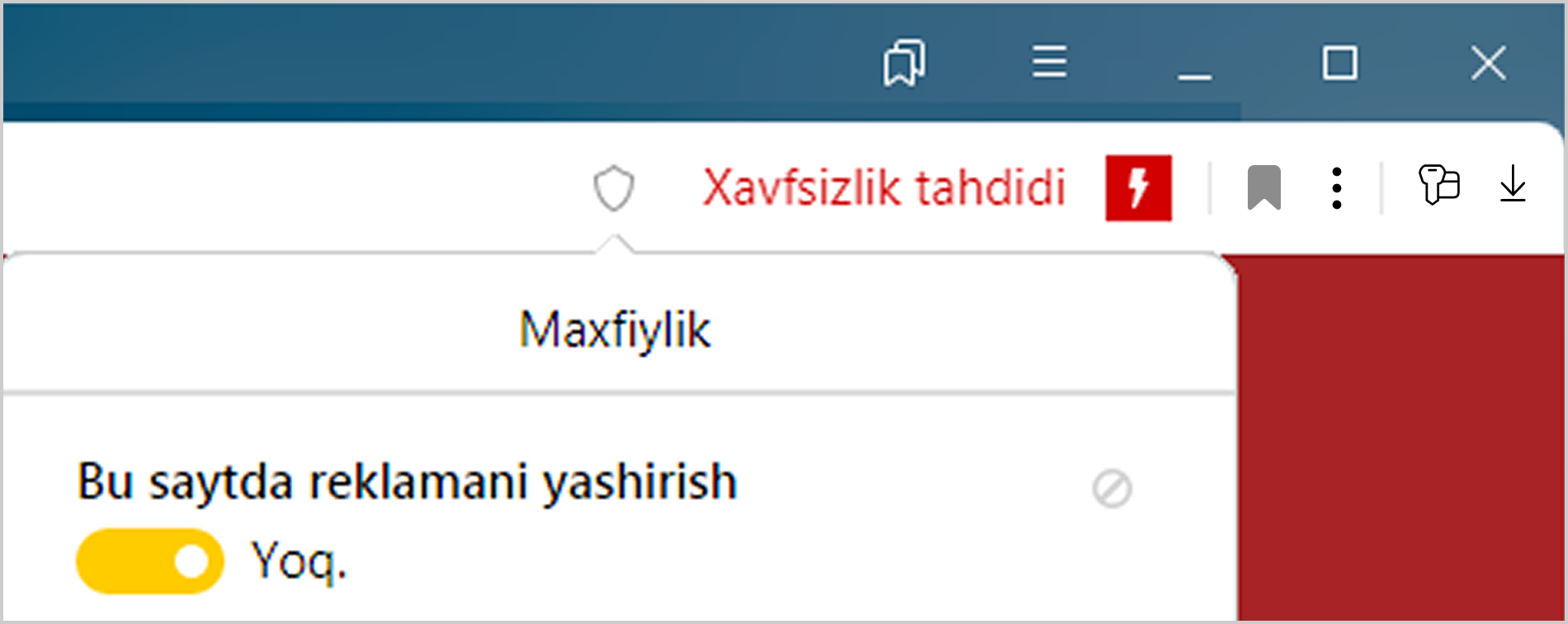 Agar bloklangan kontent kompyuteringiz uchun jiddiy xavf tug‘dirsa, uni yuklab ololmaysiz. Bu holda, Ushbu saytda reklama bloklanishi blokida Varaq uchun blokdan chiqarish havolasi bo‘lmaydi.
