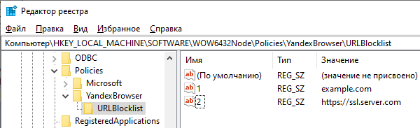 en, а для DiskCacheDir — путь к папке, например, C:\yandex_cache\. Некоторые политики требуют список из одного или нескольких значений. Например, URLBlocklist требует список URL'ов. Его можно задать двумя способами: