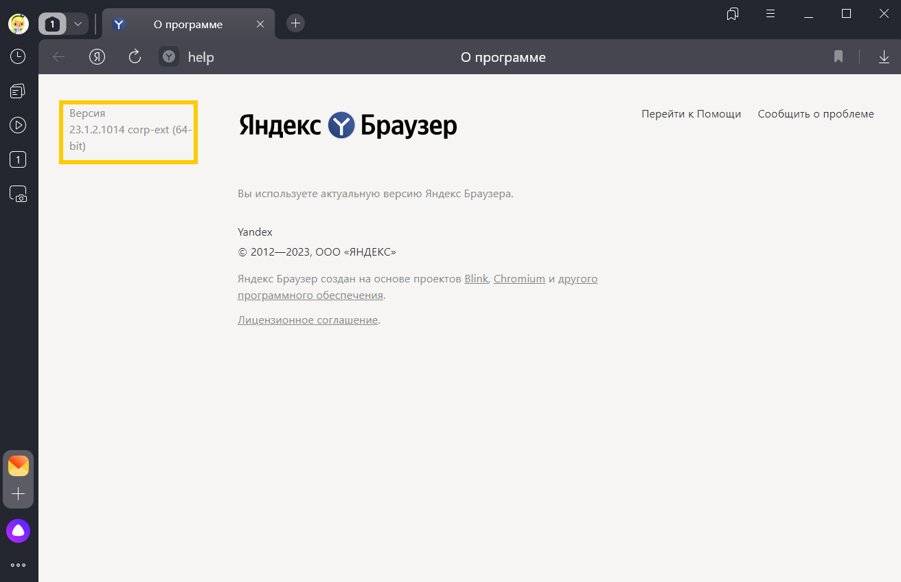 Чтобы узнать версию Браузера, наберите в Умной строке browser://help.