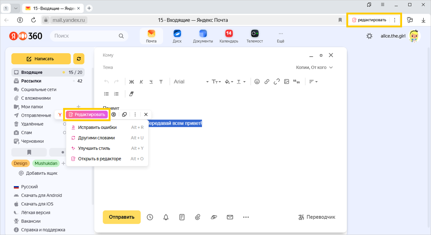 Редактор в Браузере использует нейросеть YandexGPT, чтобы исправить ошибки, улучшить стиль, переформулировать или перевести текст. Подходит для любых задач: от писем и постов в соцсетях до научных и творческих текстов.