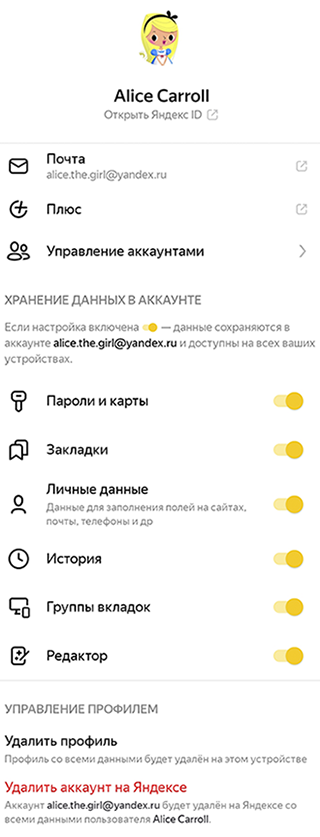 Все ваши данные сохраняются в аккаунте Яндекс ID по умолчанию, чтобы вы могли пользоваться ими на любом устройстве. Если вы хотите изменить список сохраняемых данных, отключите часть опций:
