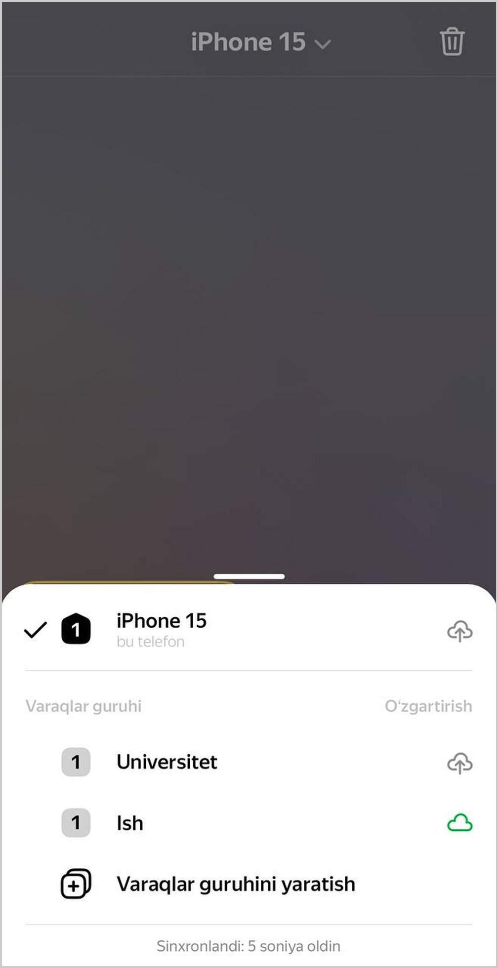 Guruhdan sinxronlash yoqilgan va Yandex Brauzer o’rnatilgan barcha qurilmalaringizda foydalanish uchun Bulut guruhi funksiyasini yoqing.