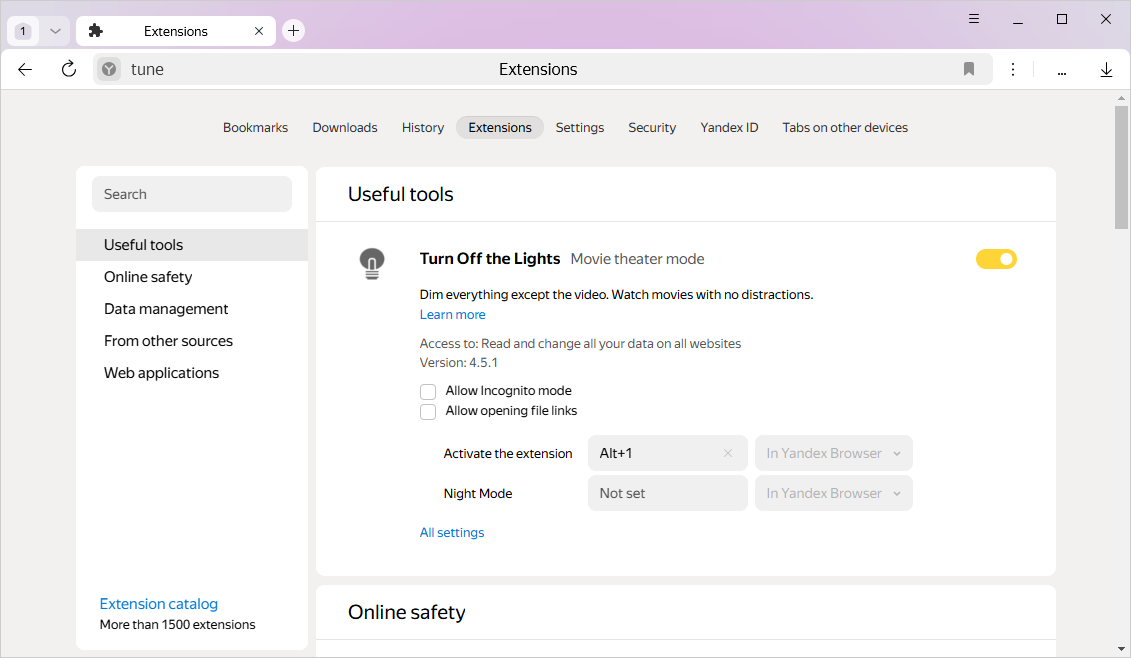 Extensions are mini-programs that provide new features. For example, they can block bothersome ads, enable night mode, or manage passwords. In Yandex Browser, you can install extensions created by the developers of Yandex Browser or from the third-party catalogs, Google Chrome and Opera.