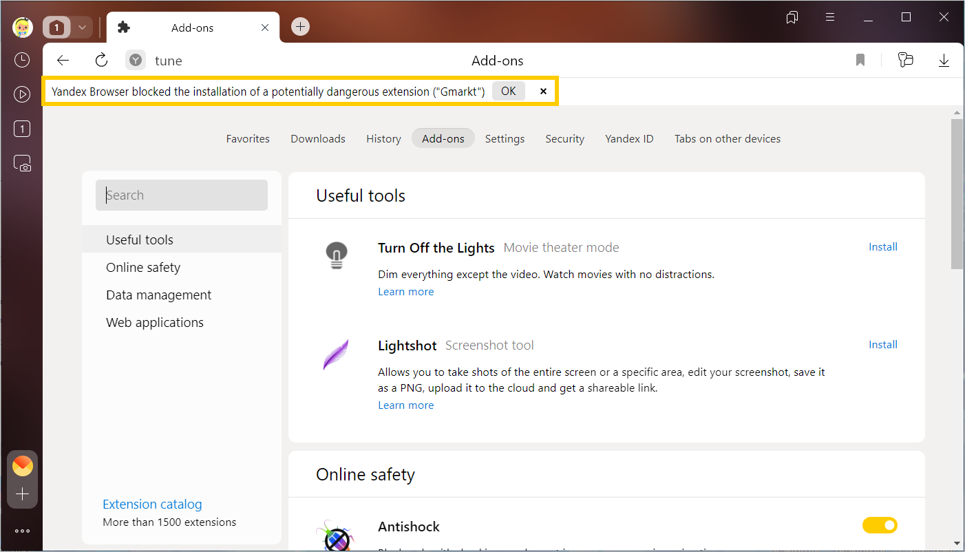 Before installing an extension, Yandex Browser checks it against a list of malicious extensions stored in a separate database. If the extension is on the list, Yandex Browser blocks its installation and notifies you of this: