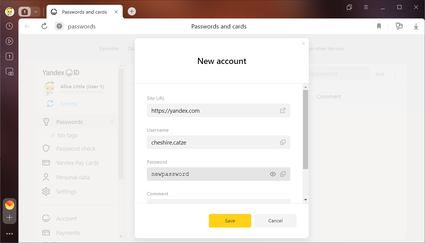 If you enter a password with no username, Yandex Browser suggests a previously saved username.