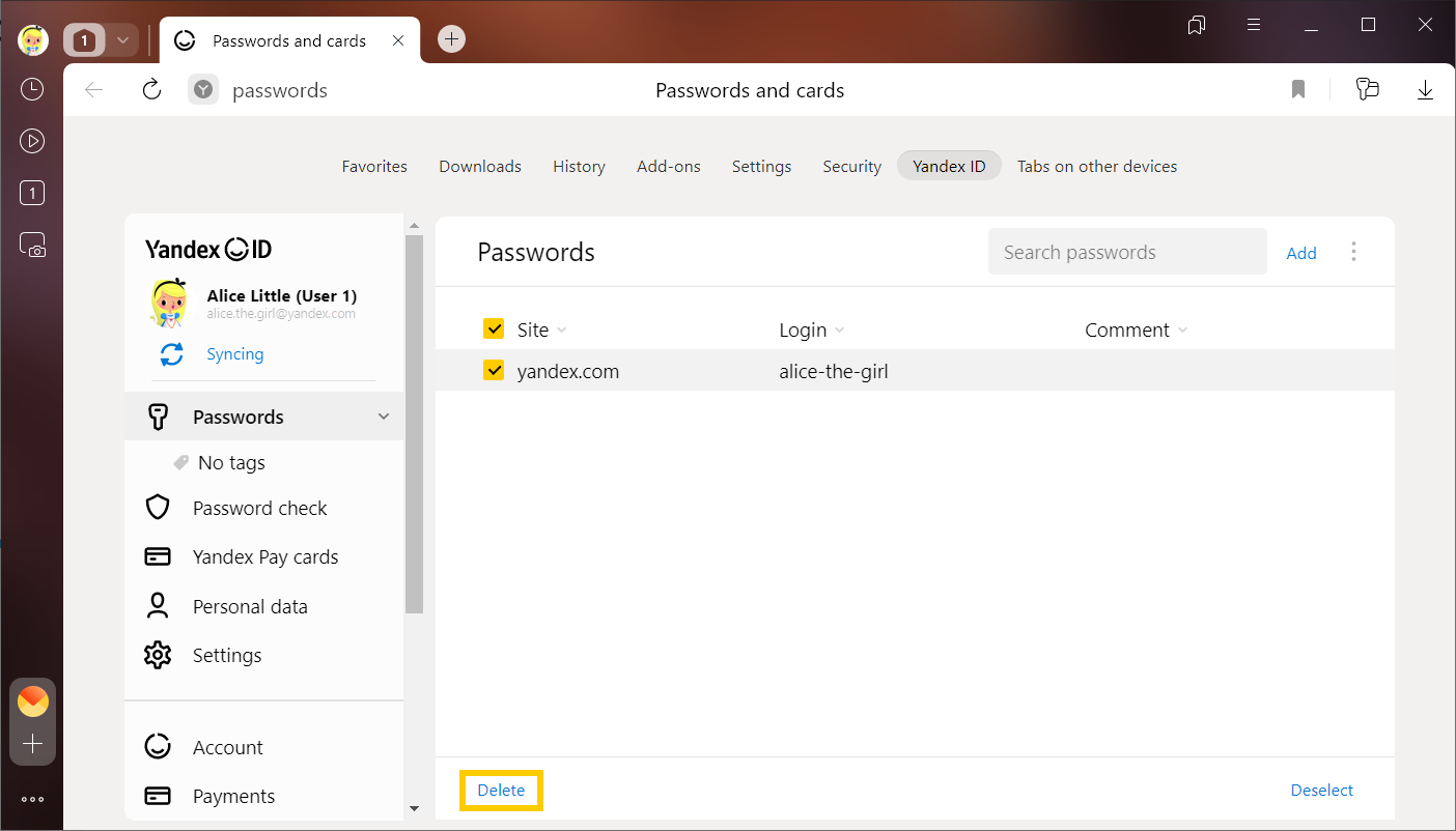 If you deleted a password by mistake, you can restore it immediately. In the lower-left corner of the password manager, click Restore. If you reload the page or switch to a different tab, you won't be able to restore the password.