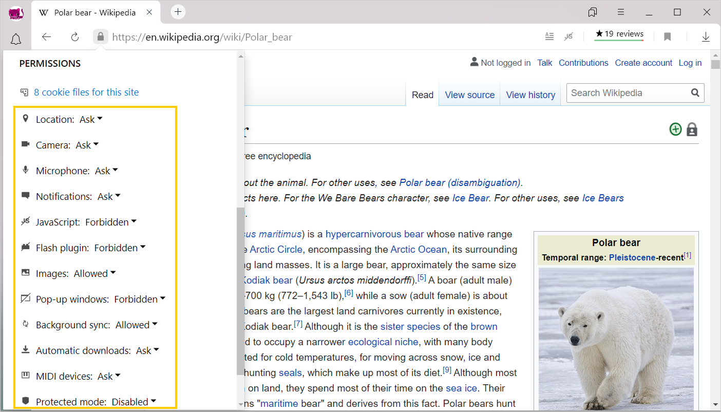 To protect your data, Yandex Browser applies various handling rules to website content. For example, it blocks pop-up windows, warns you when a website requests your location, and so on. If Yandex Browser rules interfere with how you use a website, you can set an exception for this site. For example, you can apply exceptions if you don't want Yandex Browser to warn you every time Yandex Maps requests your location. Or enhance security on a specific website by not allowing the site to run JavaScript.